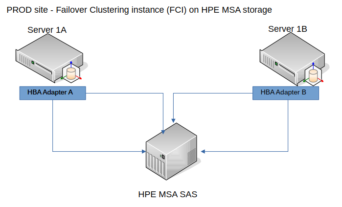 While servers and SAN path (SAS cables) are catered with multiple units, SAN is still the single point of failure as there is only 1 unit without redundancy. However, it is worth to mention that there are 2 Active-Active controllers for that HPE MSA and we also got a standby MSSQL failover instance on the DR site. It is again targeted for limited budget project which still requires redundancy.